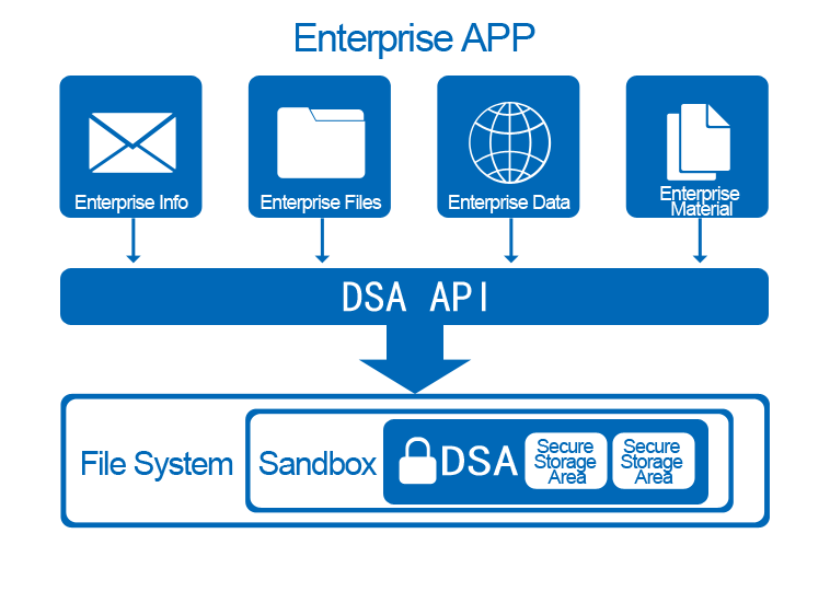 BestEMM ensures data security through the establishment of exclusive DSA. Have access to the virtual file system through DSA driver layer. The virtual file system is similar to virtual memory as virtual space to save files from the disk, which is transparent internally, hidden externally. Upper app can read and write data transparently like visiting the standard files through calling the virtual file system interface, and don't need to care data encryption security issues. DSA will automatically break data and protect data with encryption..