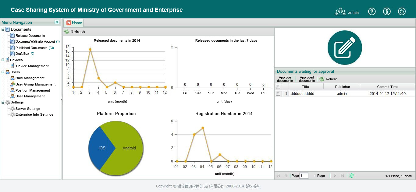 Trustmobi provides document sharing system of ministry of government and enterprise for the mobile company of some province. The system is deployed within the enterprise, can manage the documents that mobile enterprise needs to share within itself. The system adopts cloud plus client architecture, making the staff of ministry of government and enterprise share, view, discuss the internal documents in the mobile phones and tablets.