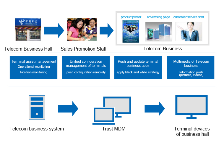 Sichuan Telecom promotes mobile office system in all business halls in the whole province, distributes dedicated mobile tablets and deploys mobile office software so that the salesperson can introduce new products anytime and anywhere and handle the business on the mobile tablets. In order to manage thousands of mobile device assets effectively and identify and standardize the identity and behavior of salesperson, Trustmobi provides customized mobile management platform for Sichuan Telecom to conduct comprehensive management and safety protection.